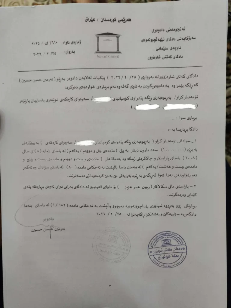 ئەمڕۆ ٦/٣/٢٠٢٦ پارێزەر ڕێبین عومەر ڕایگەیاند :ئەنجامی سکاڵا تۆمارکراوی بۆنی ناخۆشی ناوچەکانی شارەزوور و دەورووبەری بڵاوبویەوە ، دوای سکاڵا کردنی لەلایەن ڕێبین عومەرەوە لە ٢٢/١٢/٢٠٢٤ بەهۆی بۆنی ناخۆشی پاشماوەی کارگەکان لە ناوچەکە ،دادگای کەتنی شارەزوور لە ٢٥/٢/٢٠٢٦ بڕیاری داوە بە غەرامەکردنی کارگەی سکاڵا لێکراو بە بڕی ١٠٠٠٠٠٠٠٠ سەد ملیۆن دیناری عێراقی.