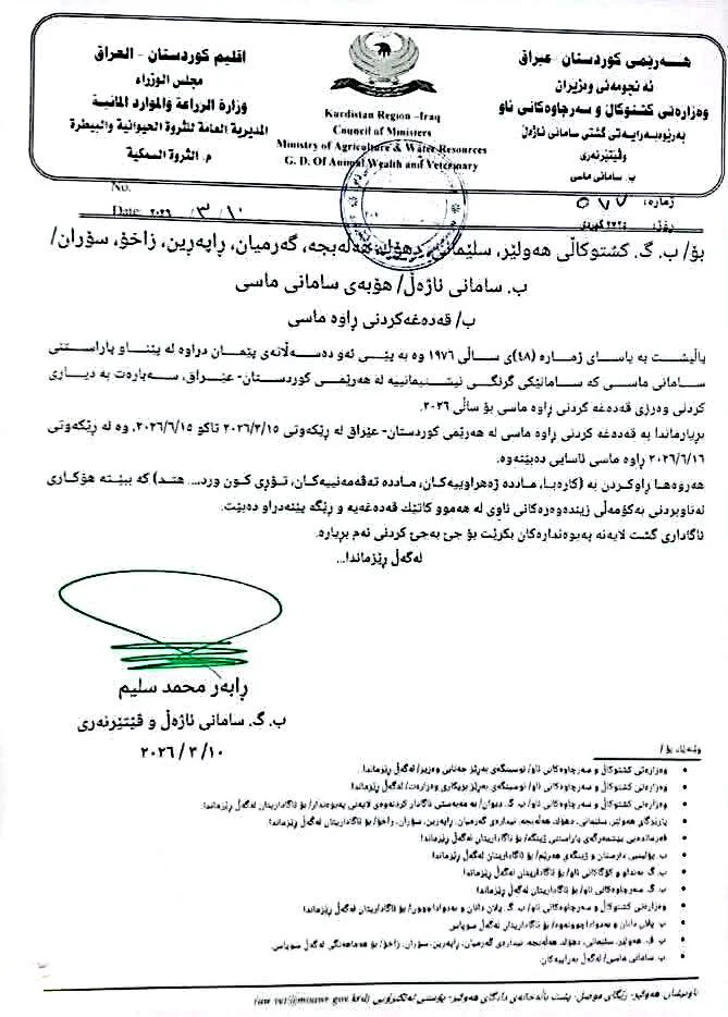 بەڕێوەبەرایەتی گشتی سامانی ئاژەڵ ڕایگەیاند: لە سبەی یەك شەممە( 15ی 3ی 2026 ) وەرزیقەدەغەی ڕاوەماسی دەستپێدەکات و هەتا ڕێکەوتی( 15ی 6ی 2026 ) بەردەوام دەبێت .